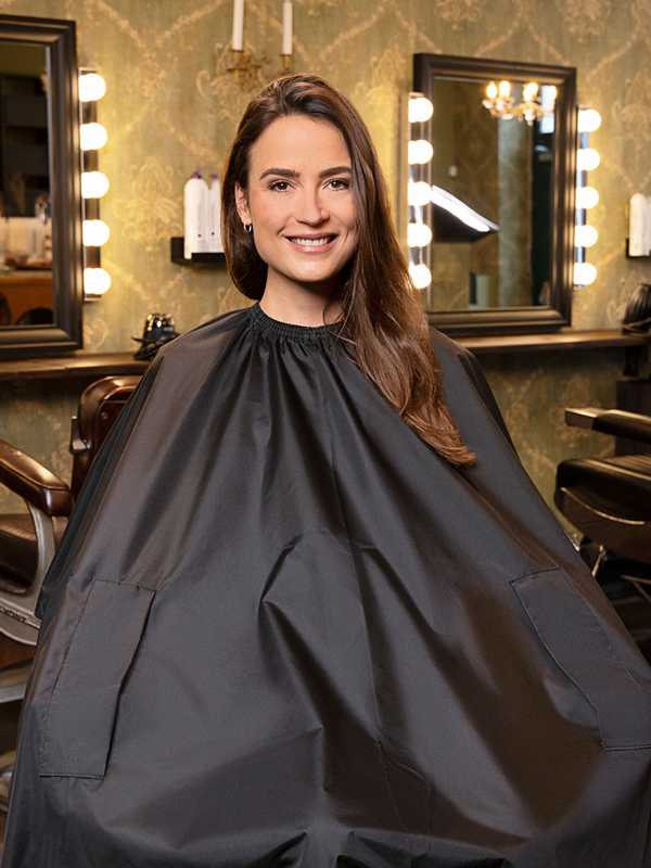 100% poliestere antimacchia. Mantella da parrucchiere con impugnature per le mani, con pratico gancio da appenderia, chiusura elastica regolabile con clip in metallo, impermeabile, antistatico, lavabile a 60°C. Dimensioni: 130 x 150 cm.