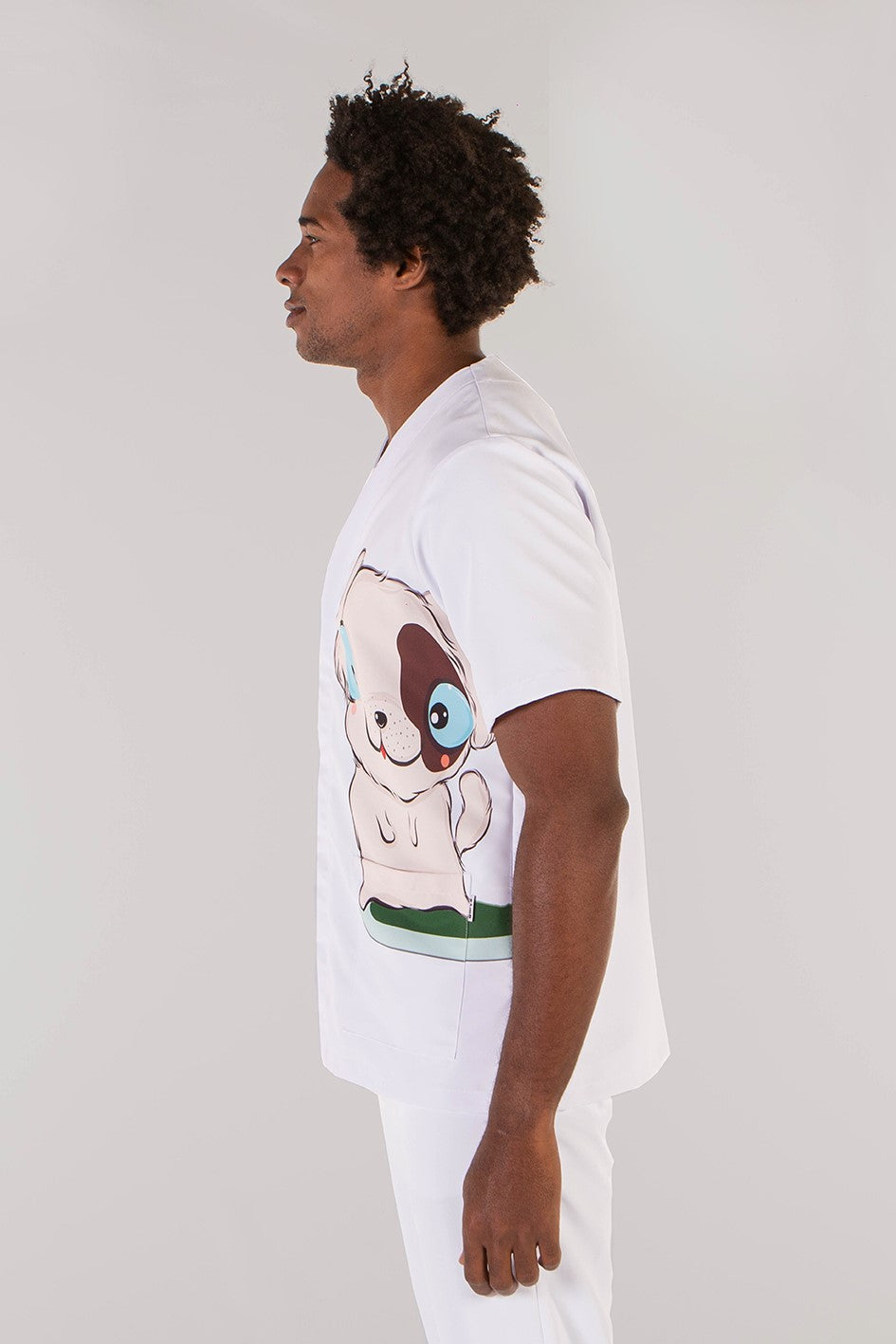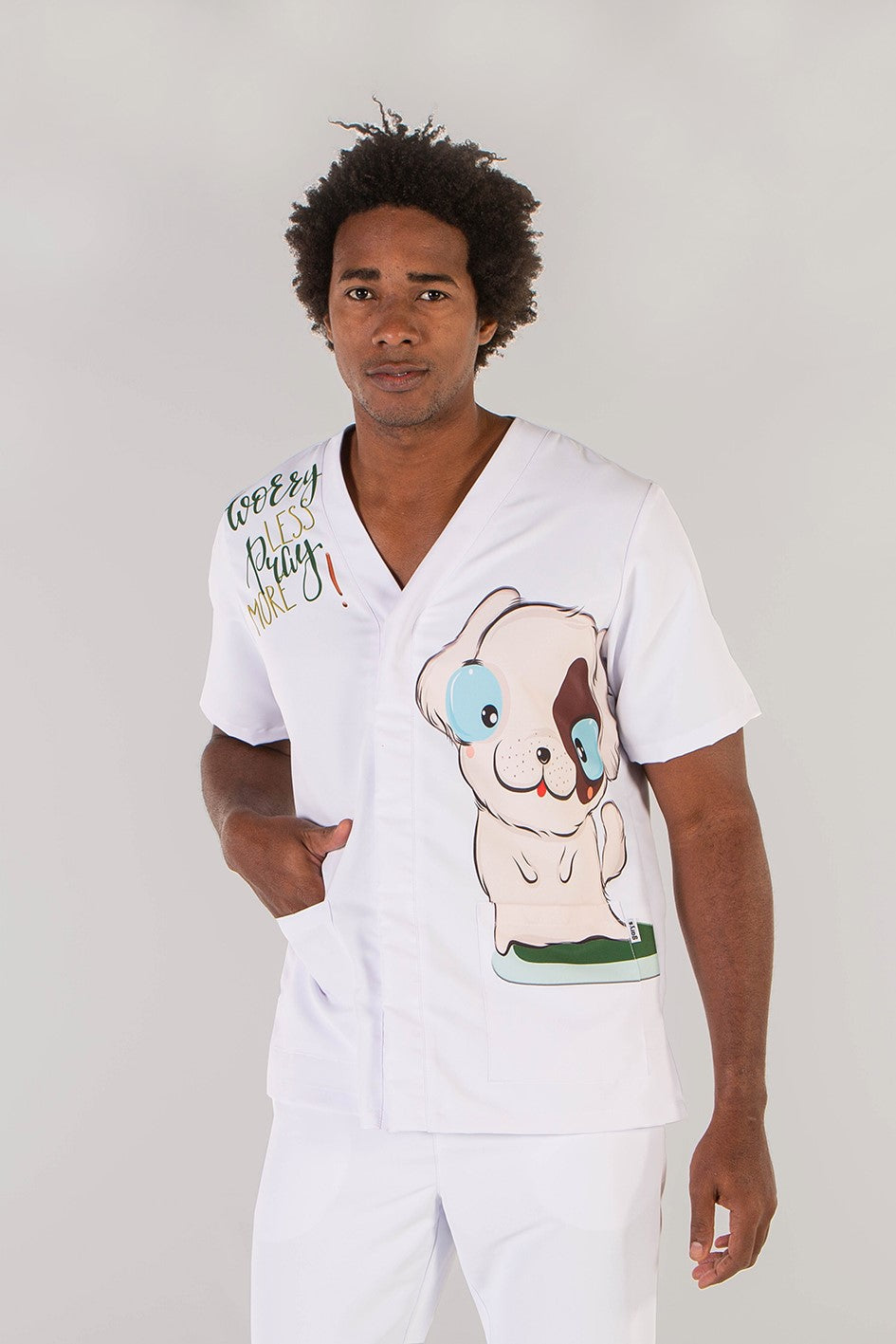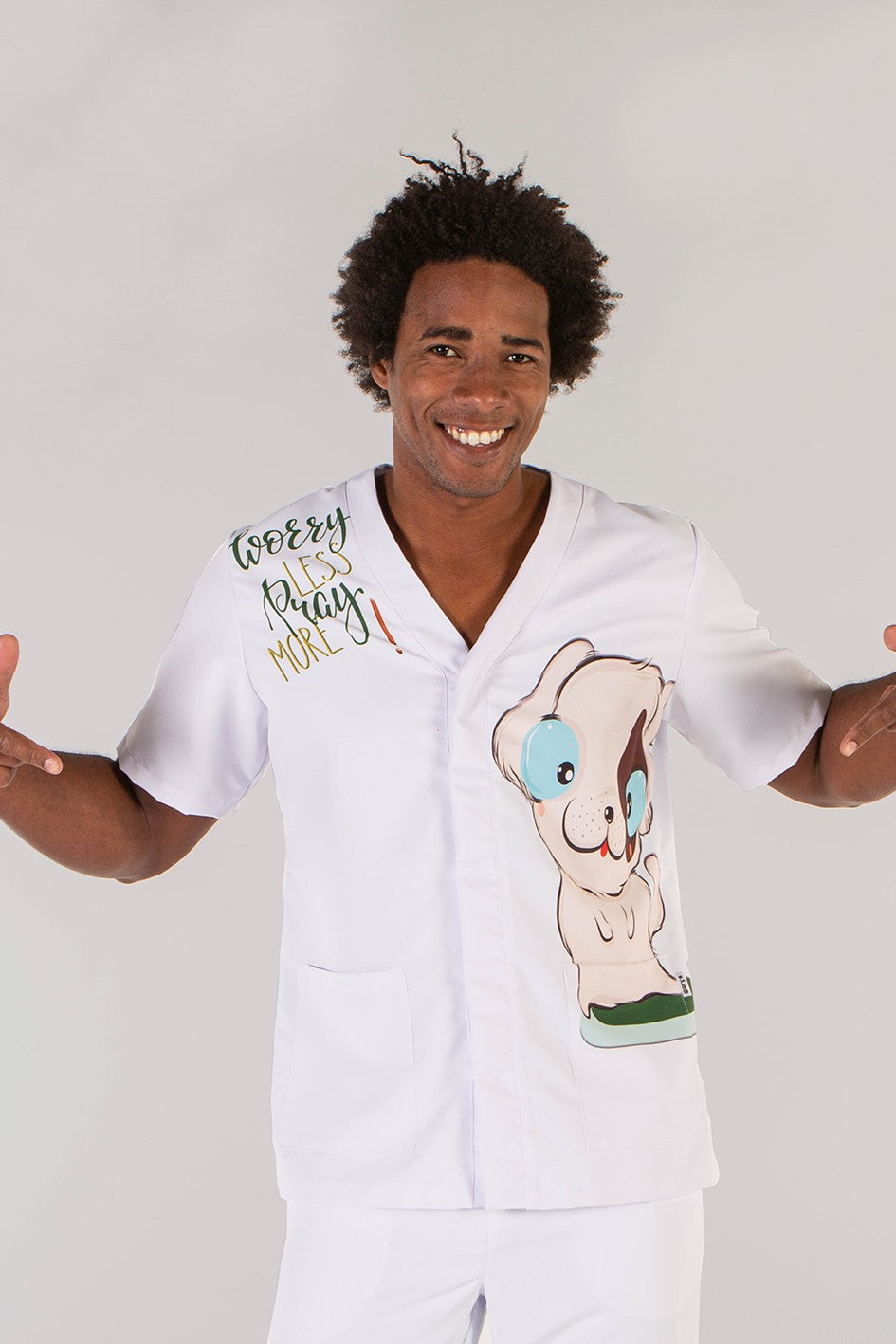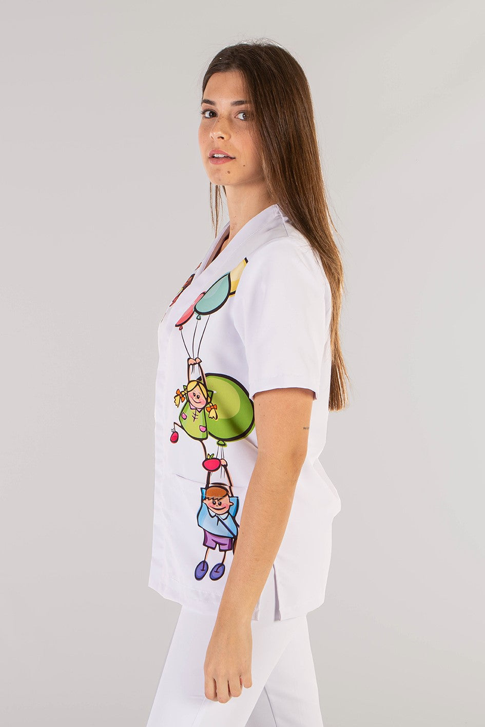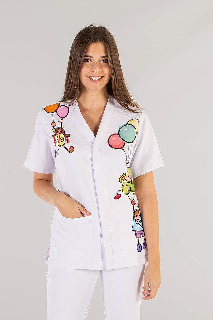 Disponibile in bianco e in due varianti stampate dal design accattivante — bambini con palloncini o adorabili cagnolini — la giacca Amaia aggiunge un tocco di simpatia e colore al vostro look professionale, senza rinunciare alla funzionalità.