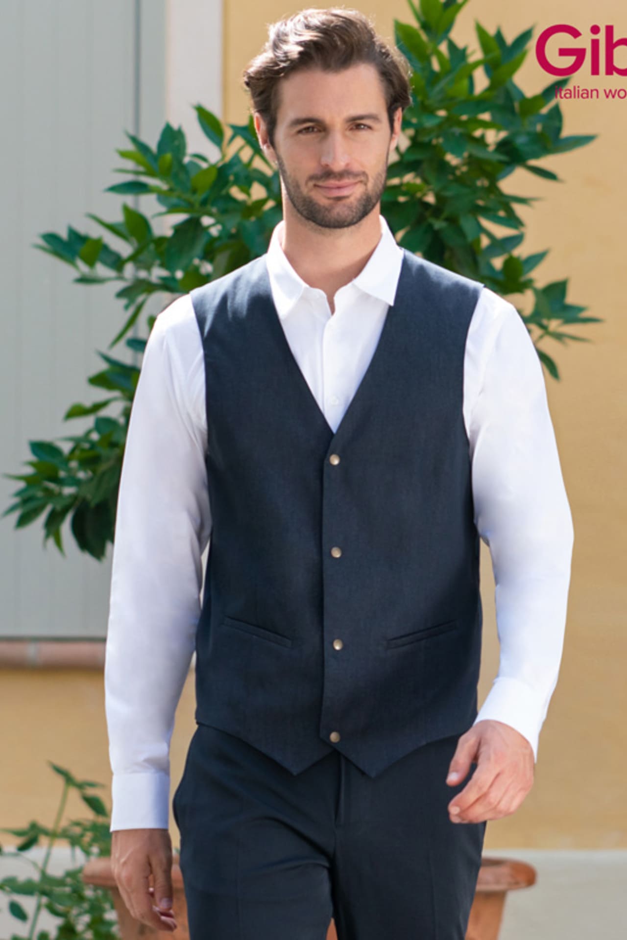 Il gilet Ho.Re.Ca. Miguel ha una vestibilità Slim Fit. Realizzato in poliviscosa elasticizzata e stabilizzata, presenta una mano morbidissima, resistente alle medie temperature. Disponibile in disegno principe di Galles dalla tonalità neutra che spazia tra bianco, nero e grigio, ha un retro a contrasto in tessuto nero con grammatura leggera e due tasche cucite sul davanti. Il risultato finale è un gilet da uomo con uno stile moderno ed eclettico, arricchito da accessori nel nero in pasta. Ha la sua versione femminile nel gilet Cora.