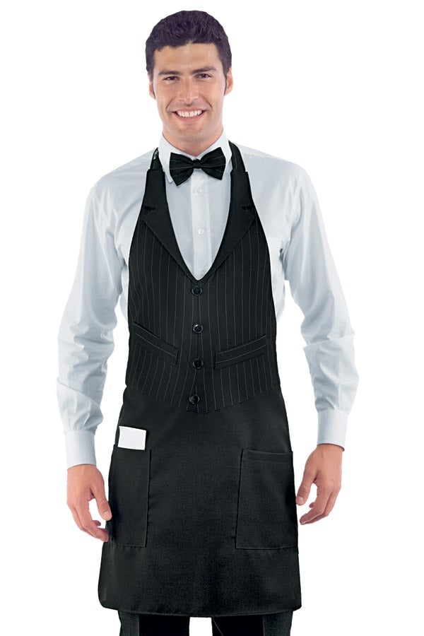 Gilet Victor unisex. Divisa da lavoro per cantine, bar, enoteche, sommelier e bistrot. Grembiule corto con 2 tasche in vita e finta di gilet con bottoni. Con allacciatura dietro al collo che ne permette la regolazione.