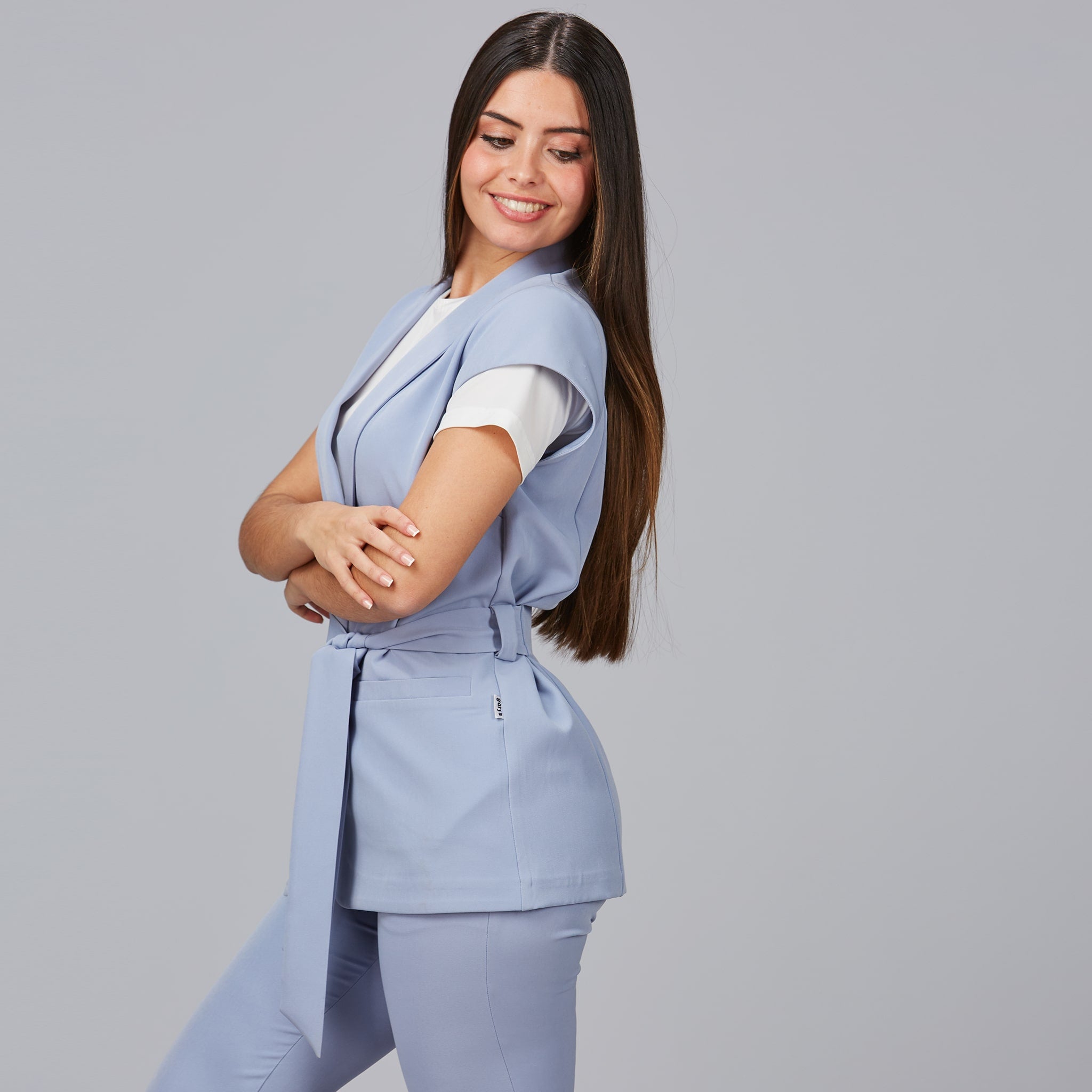 La cintura regolabile in vita aggiunge un elemento di stile e permette di personalizzare la vestibilità, valorizzando la figura femminile e assicurando un look sempre impeccabile. Le due tasche anteriori offrono spazio pratico per riporre strumenti, pennelli, pettini o accessori di lavoro, mantenendo ordine ed efficienza.