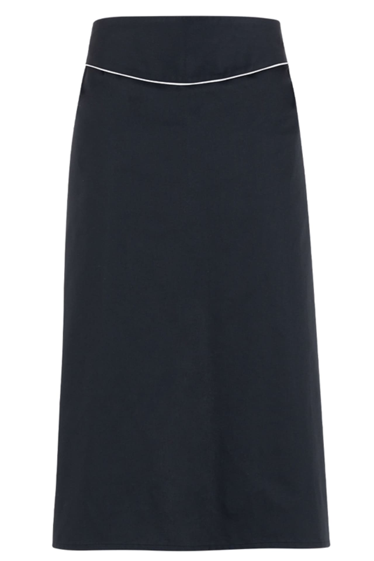 Il grembiule Giunone presenta ampie dimensioni, il caratteristico piping a contrasto, e una baschina dalla forma sinuosa. Le varianti proposte sono bianca e nera con piping grigio perla, bianca con piping tricolore.