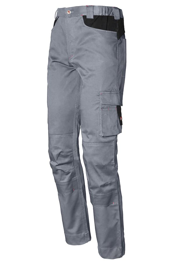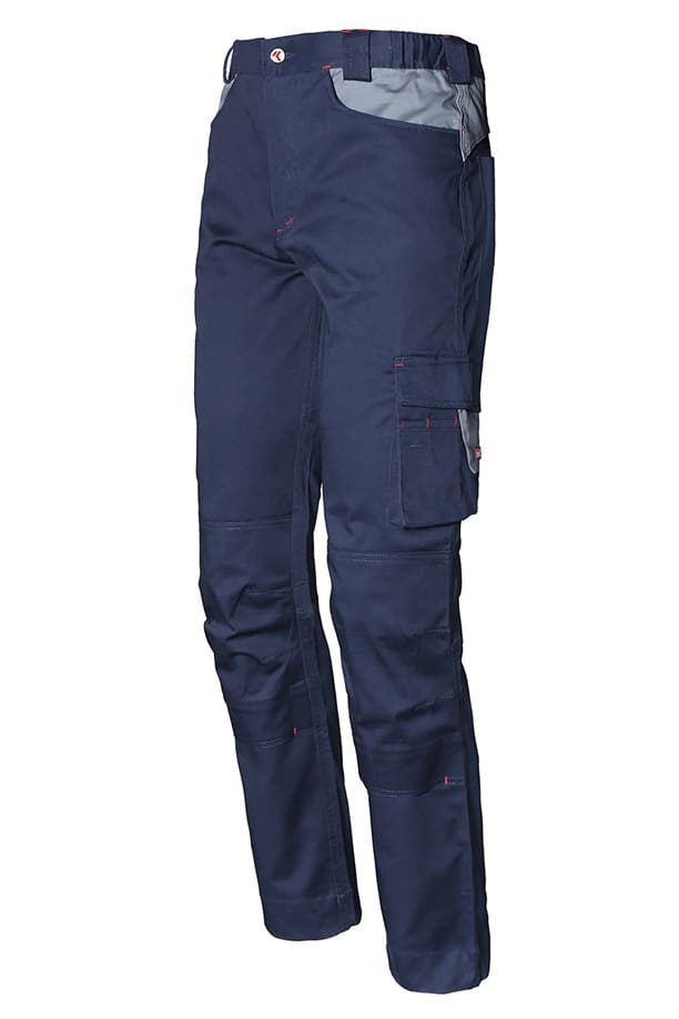 Con elastico in vita, tascone laterale e tascone porta metro, porta ginocchiere in tessuto stretch.