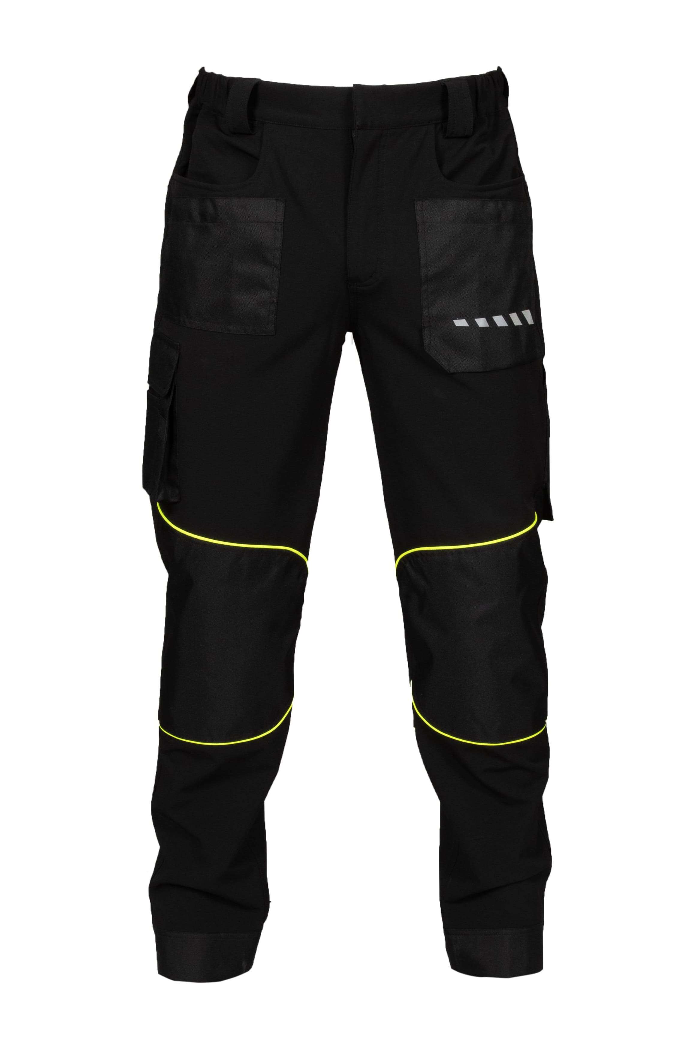 - Tessuto antistrappo sulle ginocchia con piping giallo fluo